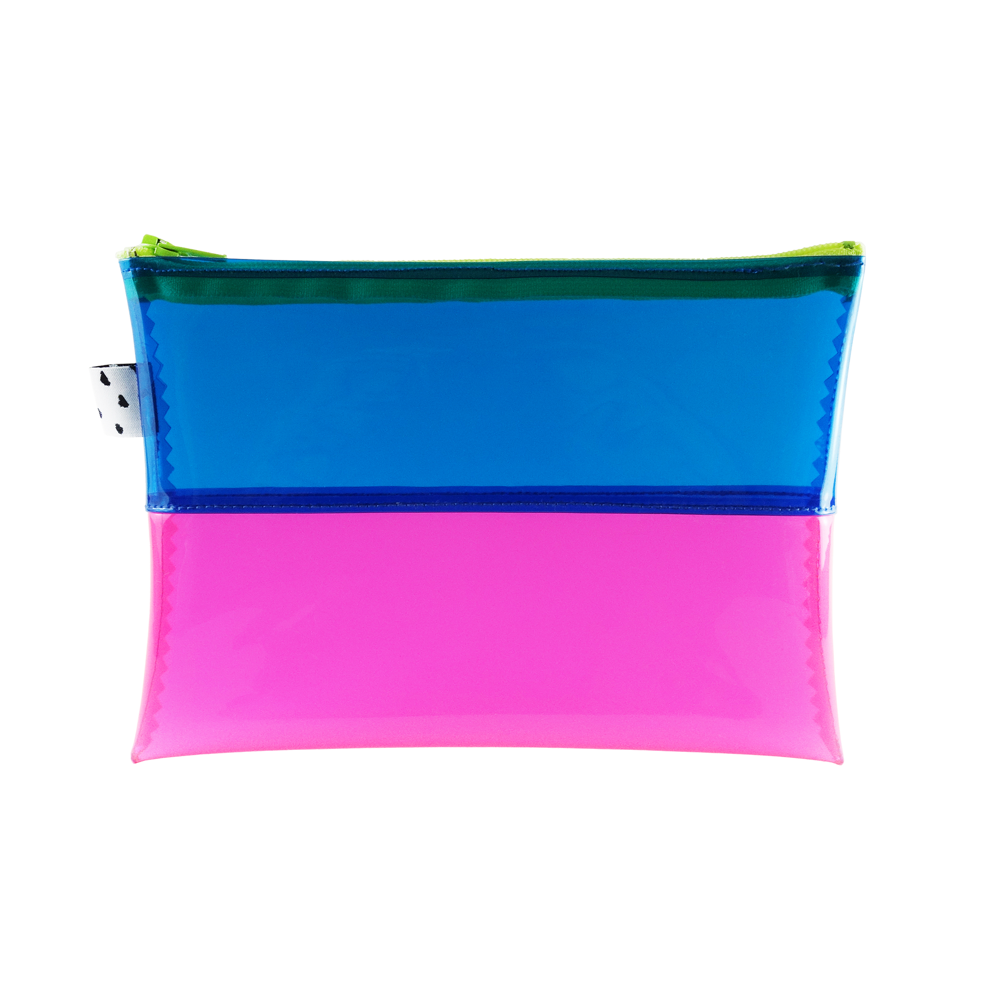 What can't fit in our wallets, can fit in this pouch. Perfect for travel! Keys, chapstick, good luck tchotchkes — what have you! Keep it all organized and compact. The blue and pink transparent vinyl pouch is completed with the pop of a bright yellow zipper.
