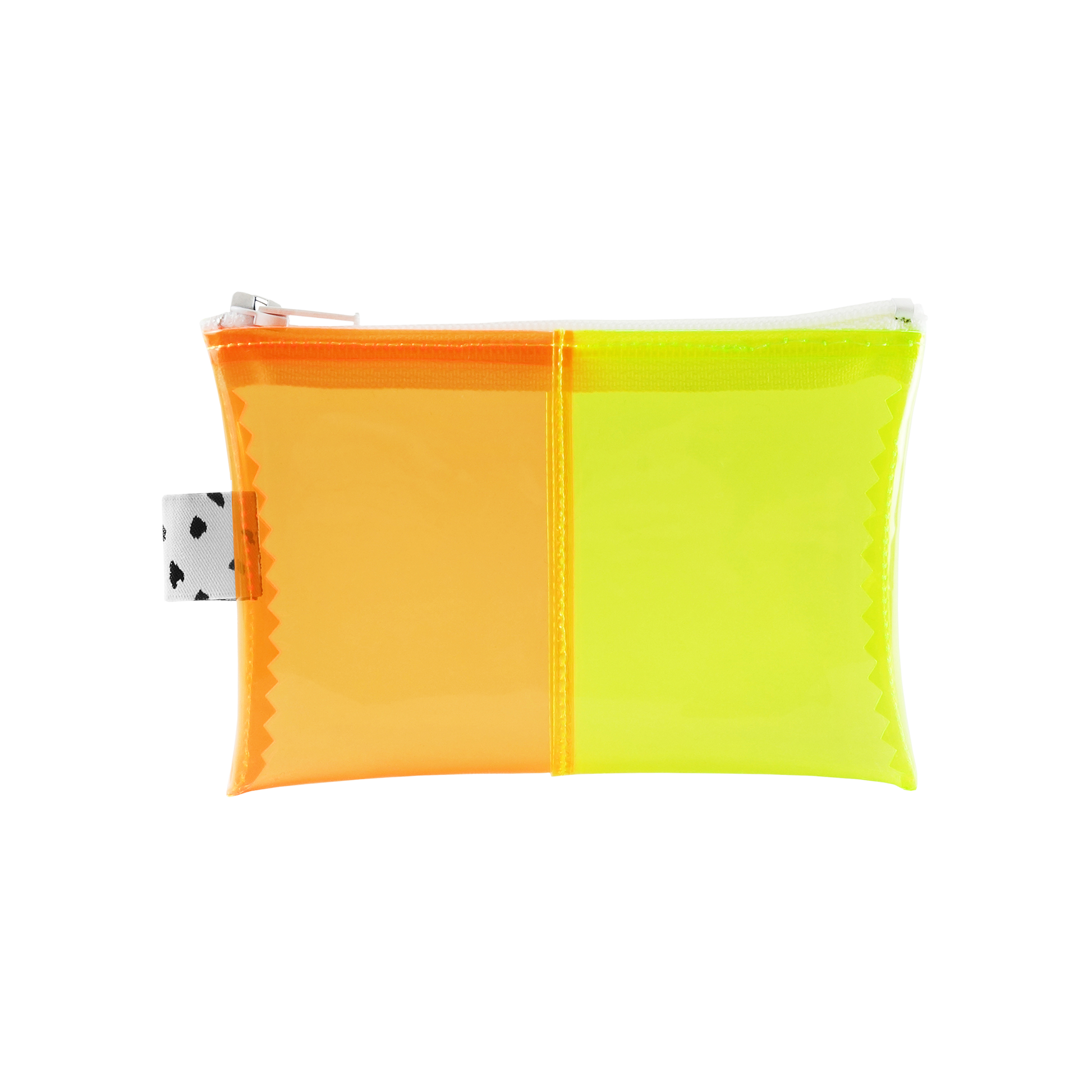 Small and sturdy! This wallet can hold all of your cards, cash and coins! This orange and yellow transparent vinyl wallet is complete with a white zipper for sealing it all shut.