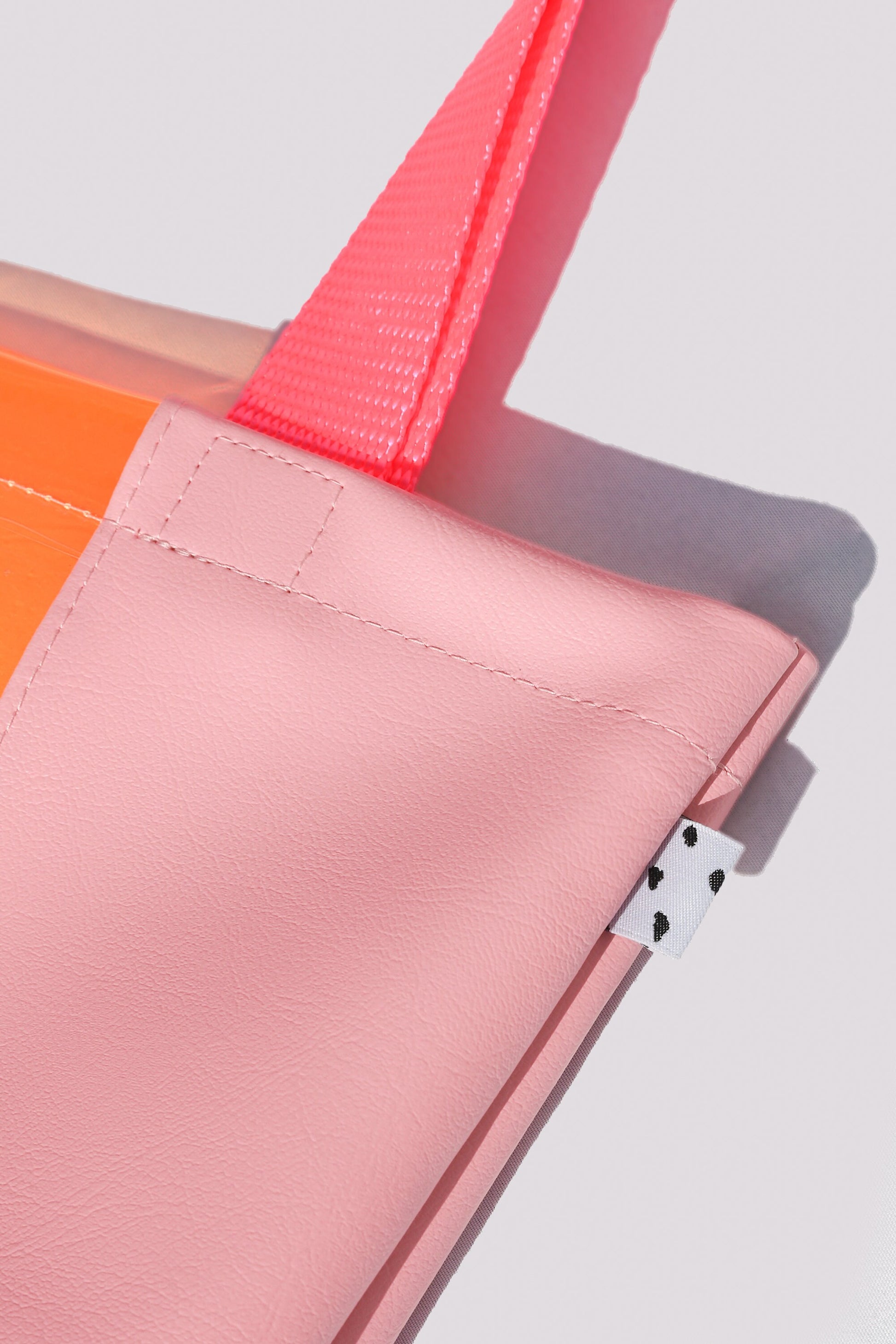 It's business mixed with play for these stripe "peek-a-boo" totes. Pink vegan leather with a transparent vinyl orange stripe and two hot pink colored 1" wide shoulder straps give you the most fun and unique tote out there.