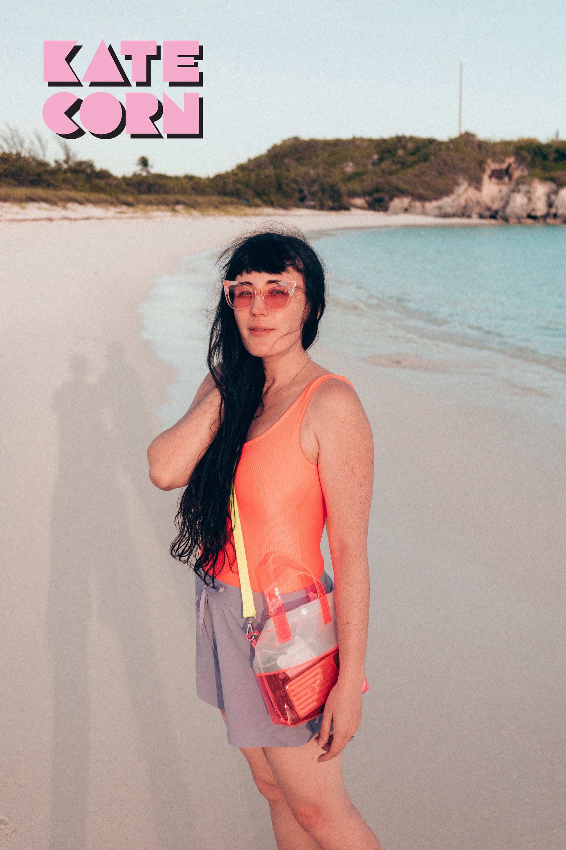 Miss your jelly sandals? This is your new favorite bag! Keep everything inside with a snap. The pink and white transparent vinyl handle bag has a white snap closure and is detailed with silver metal grommets. It's available with or without the detachable neon yellow 1" wide strap!