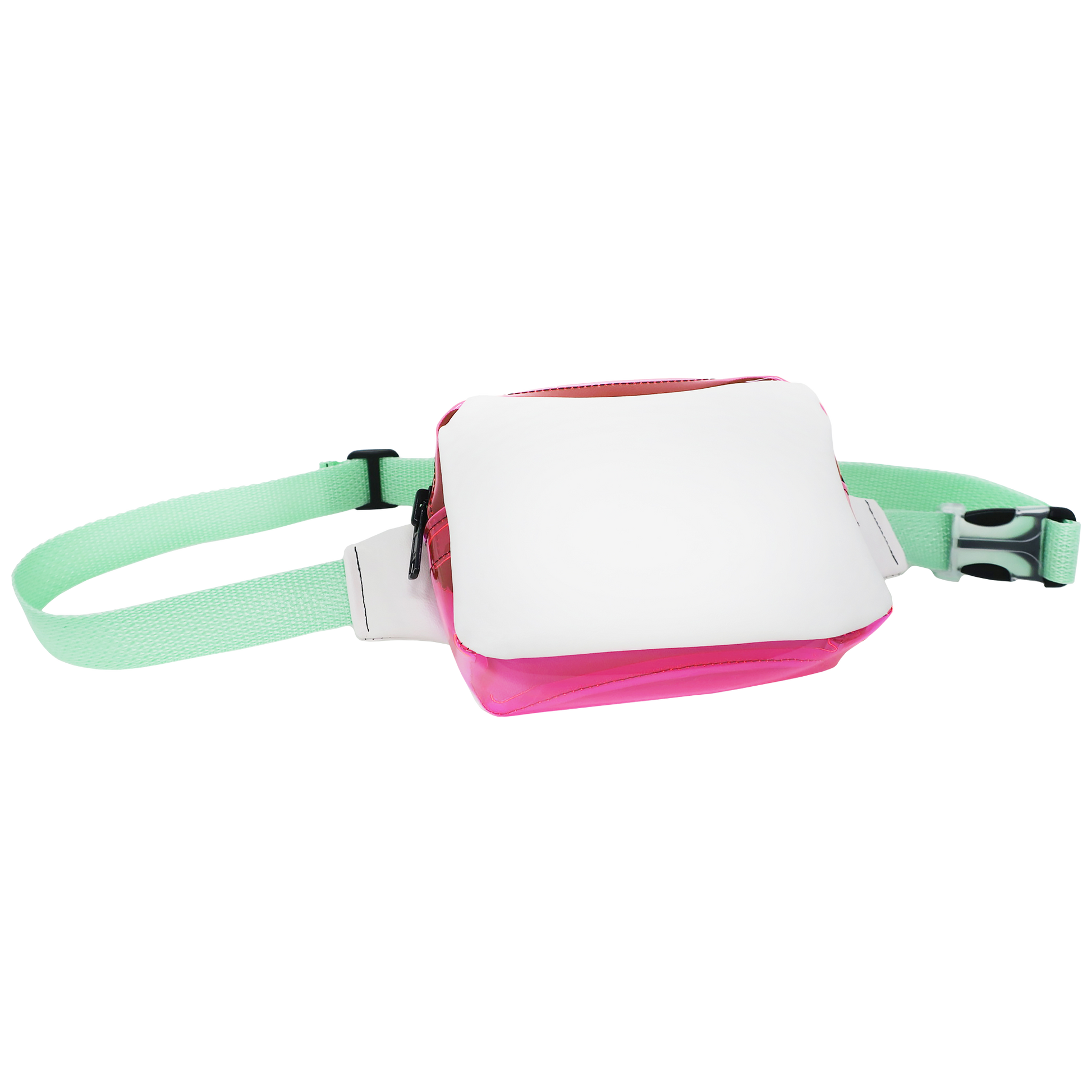 Around your waist or around your body -- this fanny pack is perfectly sized to hold all your essentials on the go! White vegan leather and pink transparent vinyl with a mint green 1" wide adjustable strap will have everyone asking you, "Where the f*** did you get that fanny pack?!" Completed with black and clear plastic hardware!